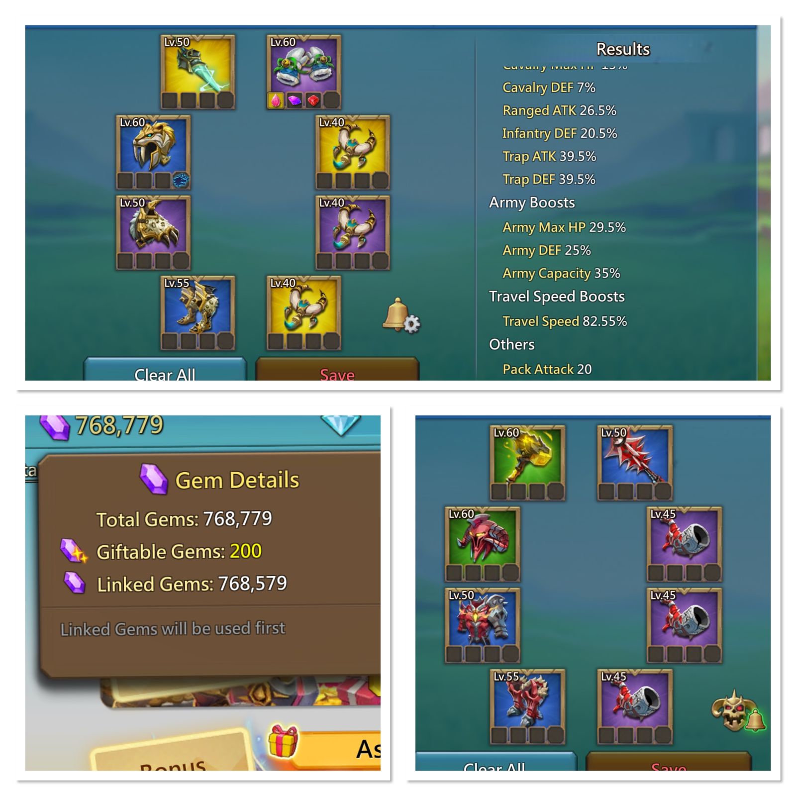 Open Kd T5 trap * 27m troops * Good migration scrolls *Many max P4 * Elite unlocked *Filled bags * Can negotiate...